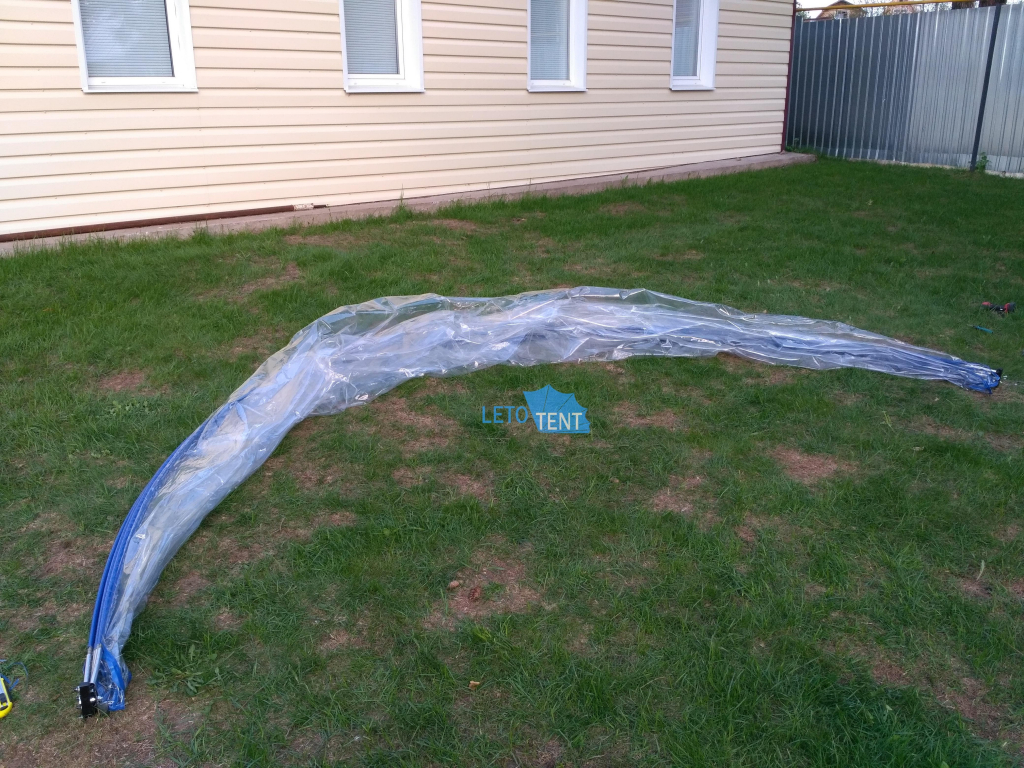 Каркас павильона для бассейна устроен из стеклопластиковых хлыстов, на которых натянуто прозрачное покрытие из экологически чистого продукта ПВХ, через который не распространяются ультрафиолетовые лучи. Так как используемый ресурс достаточно прозрачен, не возникает чувства замкнутого пространства.